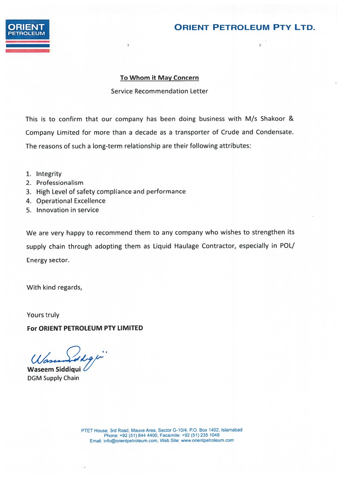 Recognition of relentless support and guidance thereby making C-track a success in Pakistan