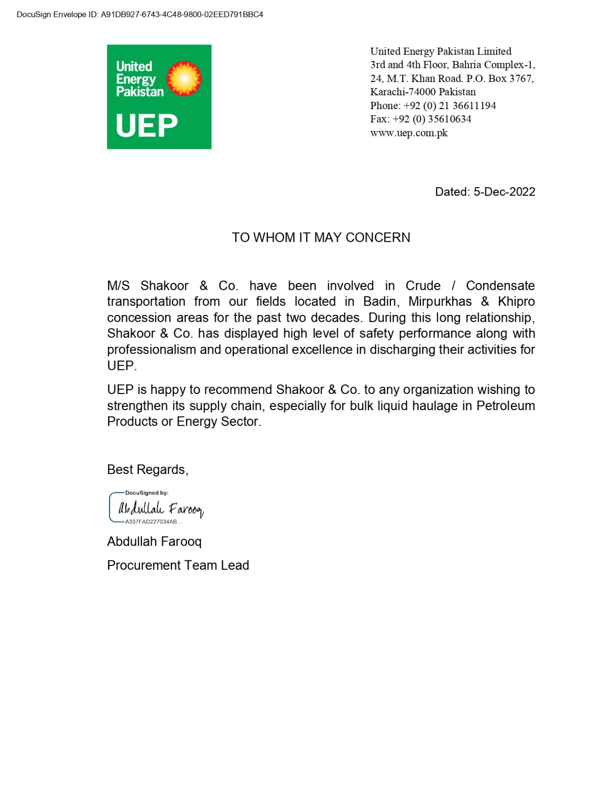 - Crude Oil & Condensate (BP Pakistan, UEP)